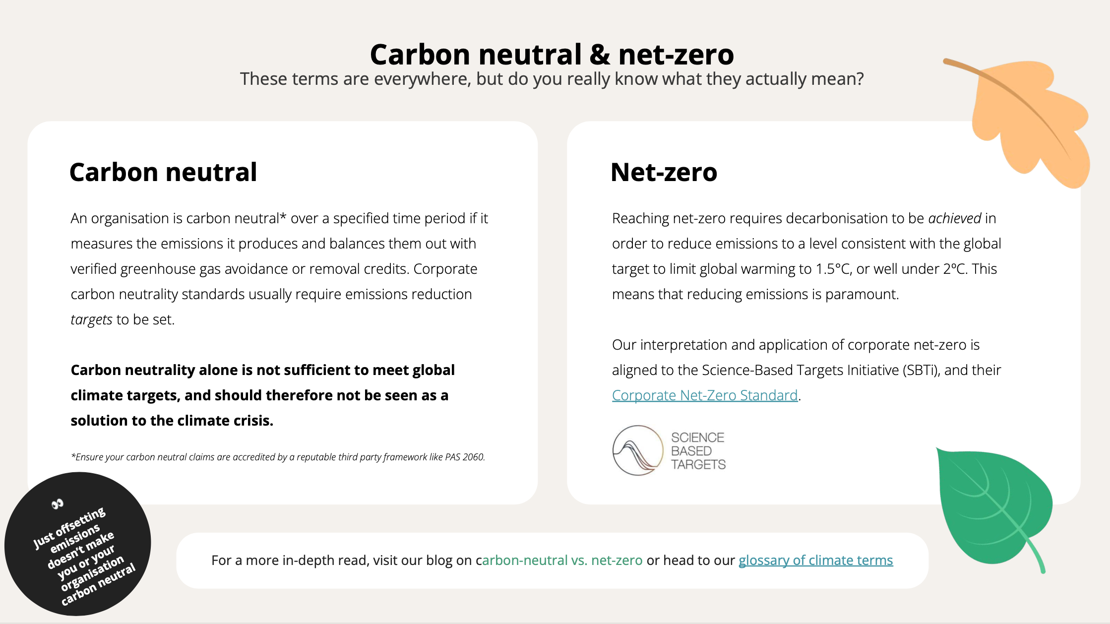 At this point, in 2024, if a company claims to be carbon neutral without a Net Zero plan, consumers should consider them to be greenwashing, and avoid giving them any money. Instead we need to support businesses that genuinely work towards reducing their carbon footprint and have clear, transparent, credible Net Zero strategies advertised prominently on their website, regularly updating them with progress being made towards their annual targets.