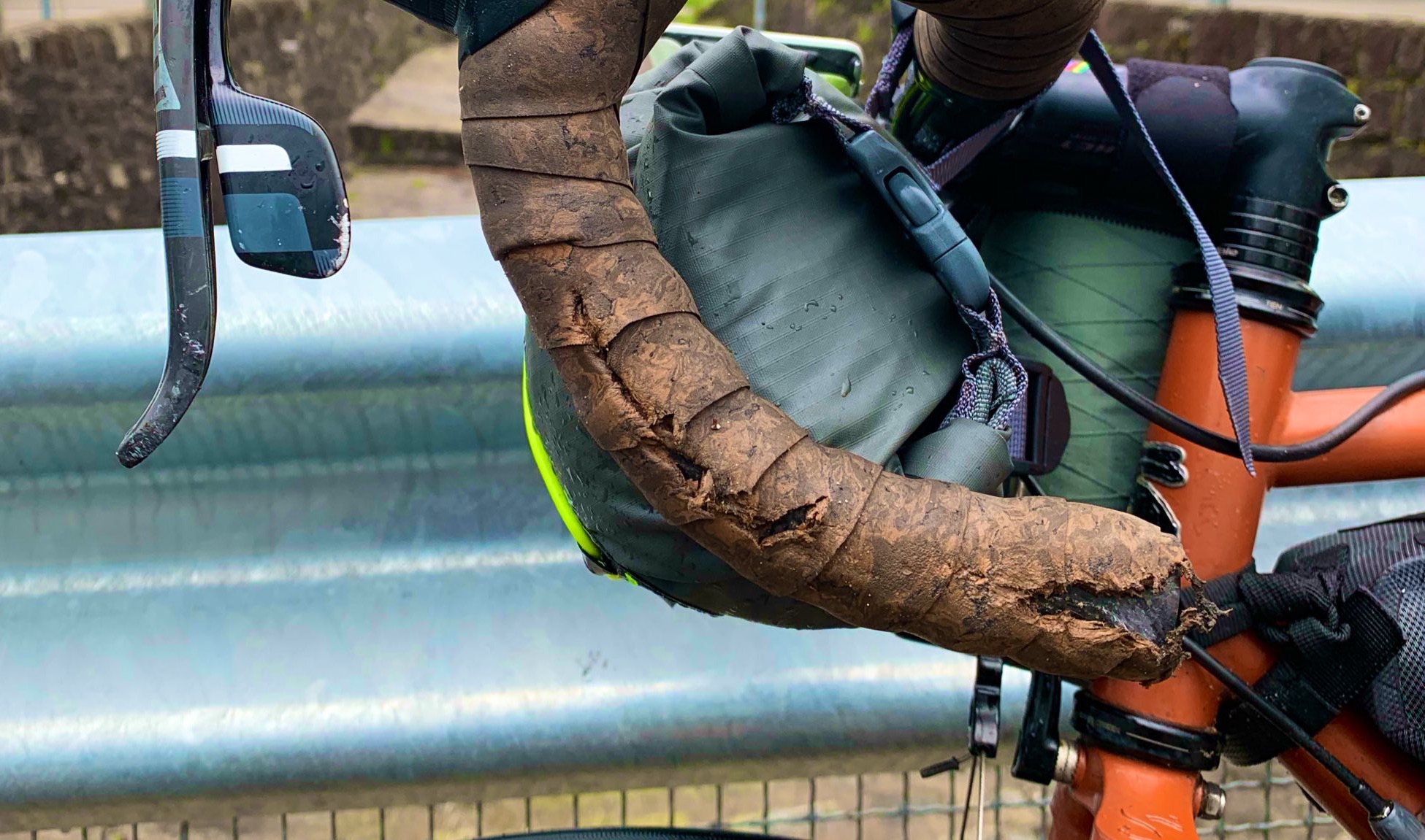 With all the tubeless trouble (leaking, burping, etc.) I pumped my tyres up pretty hard, and with the rain that was a bad choice. 20km in I hit some switchbacks and leaned into the turn way too aggressively. The front wheel lost traction and I led down at 30kph, sliding along the floor 20 meters. I scraping up my arm, leg, arse and bar tape.
