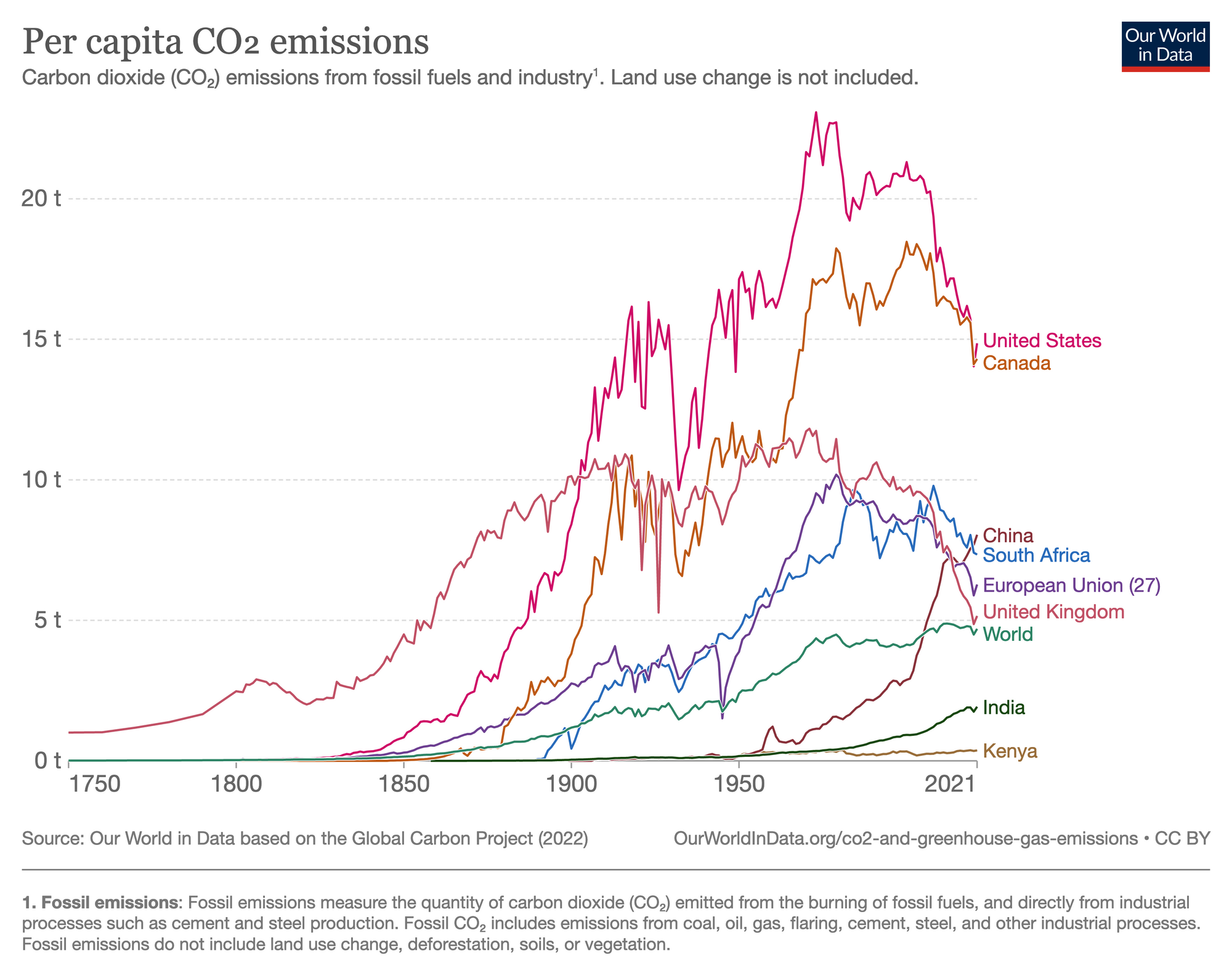 The picture changes here quite a bit, putting USA and Canada up there because people love driving around in pickup trucks and flying everyewhere. They've reduced a little bit over the last few years, some of which was the "COVID dip" where people were moving around less and energy demand patterns changed enough a few coal plants were able to get shut down, but they're still massively more wasteful than other countries' populations.