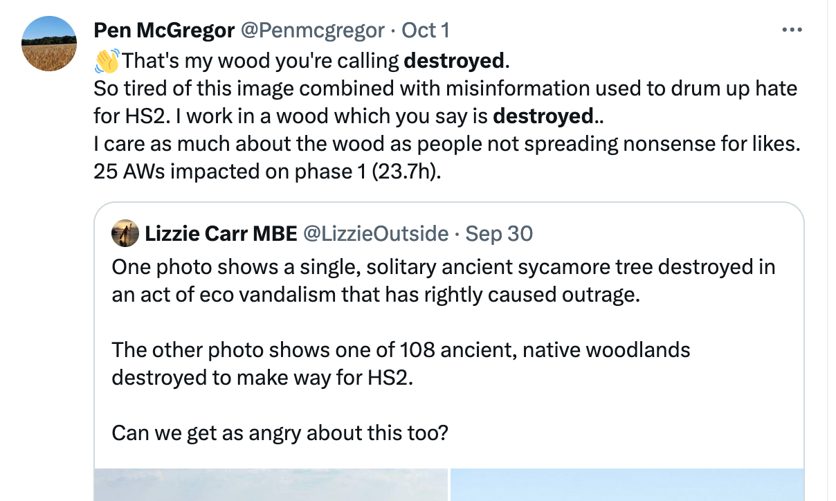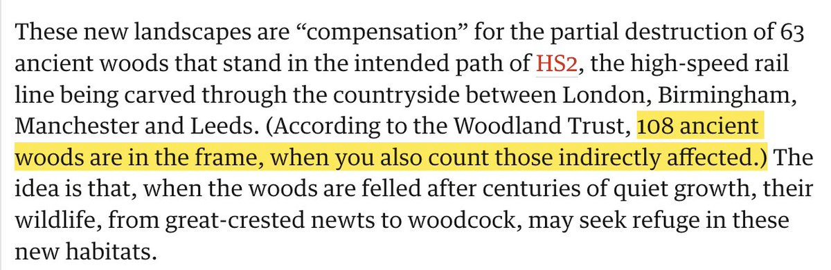 Buried in various articles on the Guardian and left-leaning media the sublty of the different between threatened ("indirectly impacted") and destroyed is explained, but this statistic never seems to pick up. Who has heard anything about "63 ancient woodlands" in relation to HS2?