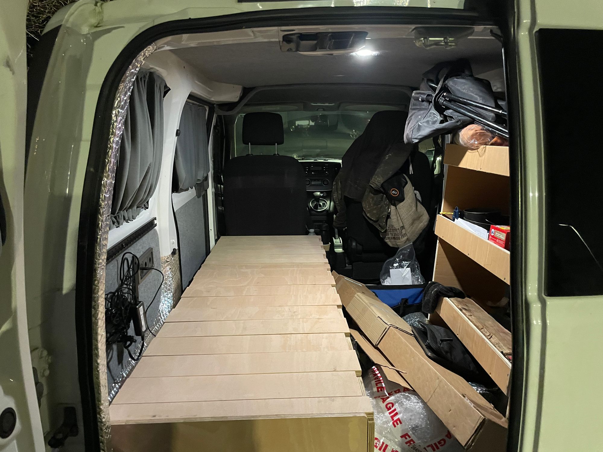 Getting a proper bed installed at a conversion place seems wildly expensive, so I grabbed a generic MDF bed kit off eBay for £330, and had the excellent Leando Services knock it together and secure it in place for £150.