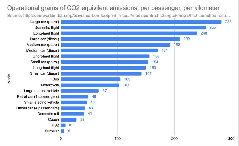 Investing mainly in only what is already doing well is the classic “we only build bridges over the river based on how many people are swimming over it” approach to transportation planning, and one that locks in dominance of whatever is already going well. Instead you should invest in the modes of transport you want to be used more, and based on the emissions per passenger kilometer its pretty clear where investment needs to be going.