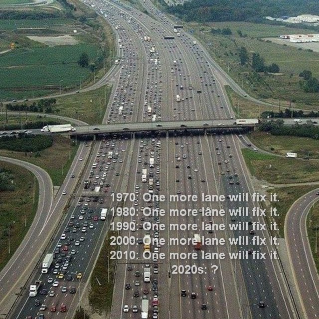 Building more roads fundamentally makes driving more appealing, so more people drive, making it slower for everyone to drive, forcing them to beg for more roads, which only ever slows things down...