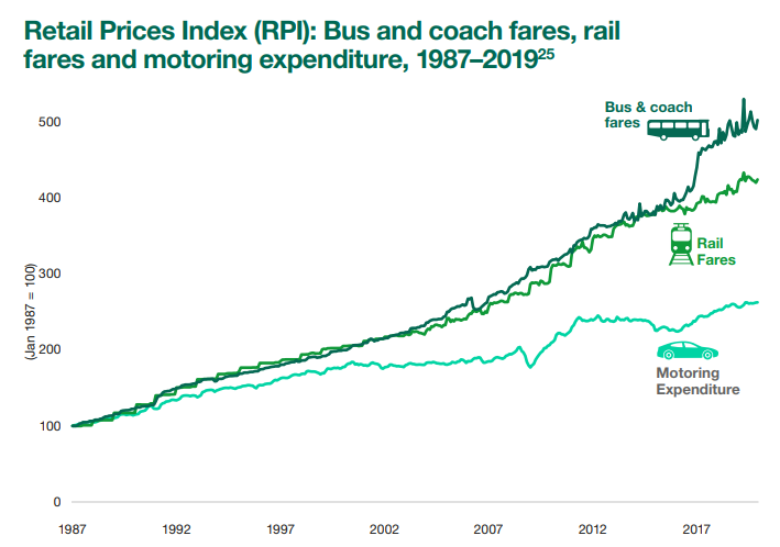 The price of petrol and diesel change over time, but part of the cost is fuel duty, which has not changed since 2010. Fuel duty is applied to petrol and diesel sales in the UK at a rate of 58 pence per litre, plus VAT. Instead of rising with inflation, this rate has been frozen since 2010, which means drivers have received a reduction in costs whilst buses and trains have got more expensive over time.